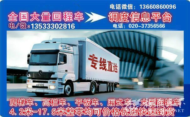 全國各地大量回程車調(diào)度網(wǎng)絡信息平臺3.8米-17.5米整車大件運輸危險品運輸、價格優(yōu)惠快速到貨網(wǎng)全國定位跟蹤系統(tǒng)手機13533302816(電話微信同步)低價運輸、公司另有專業(yè)調(diào)車人員、可配全國各地整車零擔大件運輸危險品運輸調(diào)度車輛。