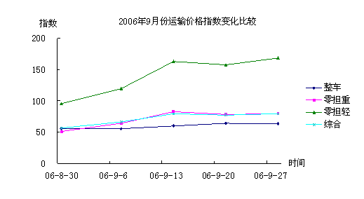 2006年9月份的運(yùn)價(jià)指數(shù)一改二季度以來(lái)的低迷走勢(shì),波動(dòng)幅度加大,同時(shí)除整車運(yùn)價(jià)指數(shù)之外均呈現(xiàn)出一定的上升趨勢(shì),這與上個(gè)月我們對(duì)運(yùn)輸價(jià)格指數(shù)變化的預(yù)測(cè)基本相符。