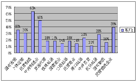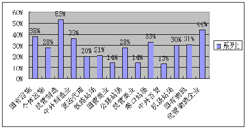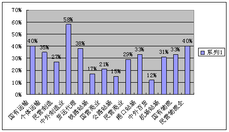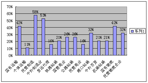 根據(jù)調(diào)查,輸送設(shè)備主要銷往:國有大中型運輸企業(yè)的占 42% ;個體運輸企業(yè)的占 11% ;民營制造業(yè)企業(yè)的占 58% ;中外合資制造業(yè)企業(yè)的占 53% ;進出口貨運代理企業(yè)的占 16% ;鐵路站場經(jīng)營單位的占 21% ;國營商業(yè)批發(fā)、百貨或超市的占 26% ;公路站場經(jīng)營單位的占 26% ;民營商業(yè)批發(fā)、百貨或超市的占 16% ;港口站場經(jīng)營單位的占 3 2% ;中外合資批發(fā)、百貨或超市的占 21% ;機場站場經(jīng)營單位的占 21% ;國有物資,倉儲、物流企業(yè)的占 42% ;民營物流企業(yè)的占 32% 。如圖 9 所示。