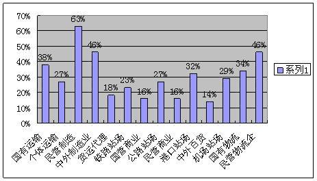 本類產(chǎn)品主要銷往:國有大中型運輸企業(yè)的占 38% ;個體運輸企業(yè) 的占 28% ;民營制造業(yè)企業(yè) 的占 53% ;中外合資制造業(yè)企業(yè) 的占 36% ;進出口貨運代理企業(yè) 的占 20% ;鐵路站場經(jīng)營單位 的占 21% ;國營商業(yè)批發(fā)、百貨或超市 的占 14% ;公路站場經(jīng)營單位 的占 28% ;民營商業(yè)批發(fā)、百貨或超市 的占 14% ;港口站場經(jīng)營單位 的占 33% ;中外合資批發(fā)、百貨或超市 的占 1 3% ;機場站場經(jīng)營單位 的占 30% ;國有物資,倉儲、物流企業(yè) 的占 31% ;民營物流企業(yè) 的占 44% 。如圖 13 所示。