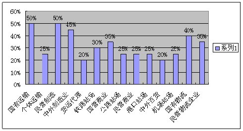 本類產(chǎn)品主要銷往:國有大中型運輸企業(yè)的占 50% ;個體運輸企業(yè)的占 25% ; 民營制造業(yè)企業(yè)的占 50% ;中外合資制造業(yè)企業(yè)的占 45% ;進出口貨運代理企業(yè)的占 20% ;鐵路站場經(jīng)營單位的占 30% ;國營商業(yè)批發(fā)、百貨或超市的占 35% ;公路站場經(jīng)營單位的占 25% ;民營商業(yè)批發(fā)、百貨或超市的占 25% ;港口站場經(jīng)營單位的占 25% ;中外合資批發(fā)、百貨或超市的占 20% ;機場站場經(jīng)營單位的占 25% ;國有物資,倉儲、物流企業(yè)的占 40% ;民營物流企業(yè)的占 35% 。如圖 12 所示。