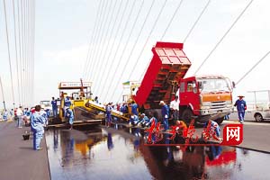 經(jīng)過(guò)建設(shè)者40天的艱苦施工,蘇通大橋主橋面環(huán)氧瀝青攤鋪任務(wù)國(guó)慶期間全部完成。據(jù)悉,環(huán)氧瀝青性能大大優(yōu)于普通瀝青,具有很高的強(qiáng)度,且在高溫下變形很小,其使用壽命是普通瀝青的幾十倍。蘇通大橋使用這批價(jià)值3000多萬(wàn)元的進(jìn)口環(huán)氧瀝青,確保大橋工程質(zhì)量達(dá)到世界一流標(biāo)準(zhǔn)。