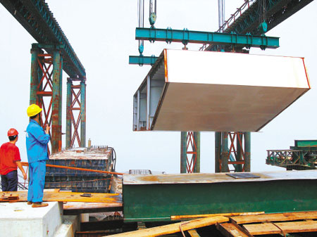 位于杭州經(jīng)濟技術(shù)開發(fā)區(qū)和蕭山區(qū)之間的錢江九橋(江東大橋)是錢塘江上投資規(guī)模最大,施工難度最大的交通建設項目,建成后將是錢塘江上最漂亮的一座大橋。目前水下和引橋樁基、承臺施工全部完成,正在進行鋼箱梁吊裝施工及現(xiàn)澆箱梁掛籃施工。
