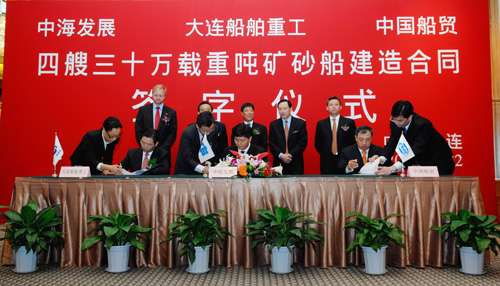 中海發展集團、大連船舶重工公司及中國船貿公司的代表日前在大連,為建造4艘運力30萬噸、造價約4.5億美元的超大型礦砂船舉行簽字儀式(圖)。該4艘船將分別在2011年8月至2012年3月陸續交付。