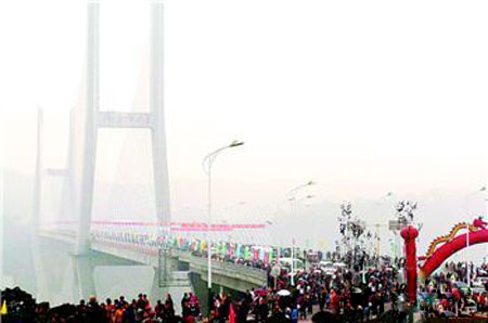 10月28日,數(shù)萬(wàn)當(dāng)?shù)厝罕娂娂娮呱洗髽蛴^看通車(chē)盛況。當(dāng)日,重慶涪陵區(qū)李渡長(zhǎng)江大橋正式通車(chē)。該橋全長(zhǎng)822米、雙向四車(chē)道。從此,三峽庫(kù)區(qū)又增加了一座長(zhǎng)江大橋。