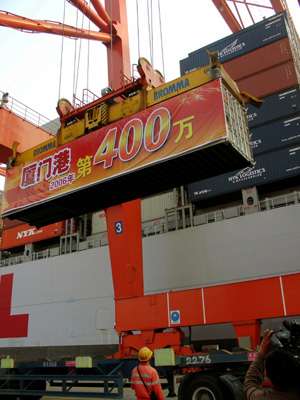 廈門港方面,隨著東方海外貨柜航運(中國)有限公司的“東方寧波”號,靠泊海滄港區海潤碼頭作業,該港完成了今年400萬標箱的運輸目標。廈門港是從今年元旦開始實施港口一體化管理運作的。在實施之前,該港的年集裝箱吞吐量還在330多萬標箱上徘徊。而不到一年時間,達到了年吞吐量400萬標箱的目標。廈門市副市長潘世建說:“我們還同時建設客運大港。未來不久,廈門將會成為中國的客貨運樞紐大港!