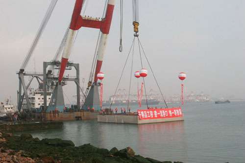 圖:青島新前灣集裝箱碼頭建設第一個沉箱安放儀式在青島港前灣港區南岸隆重舉行
