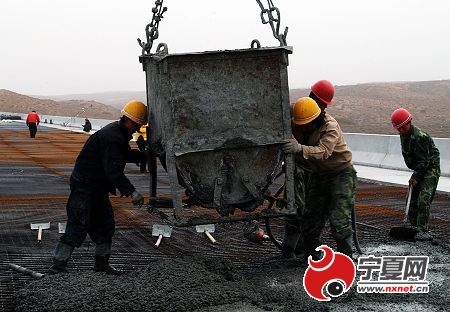 昨天,橋梁工人在鹽中高速公路雙陰溝大橋上緊張地進行水泥混凝土澆筑。雙陰溝大橋地處中寧縣恩和鄉(xiāng)境內(nèi),大橋長546米,最高橋墩達(dá)到21米以上,是鹽中高速公路上跨度最大、高度最高的工程之一。