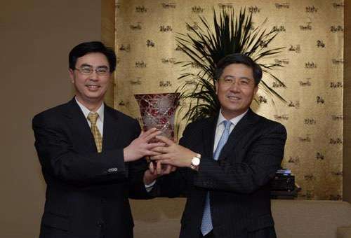 圖:中海集運總經理黃小文(左)送禮瓶給中遠集運總經理孫家康