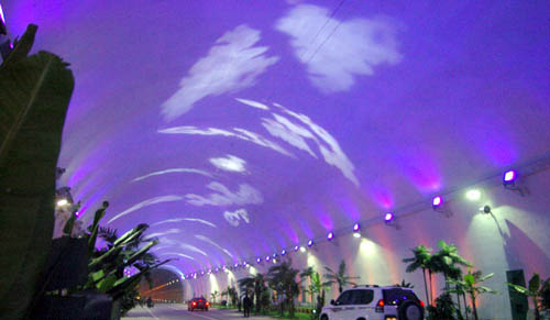 圖為汽車在有特殊燈光效果的秦嶺終南山公路隧道內(nèi)行駛(1月17日攝)。新華社記者 陶明 攝