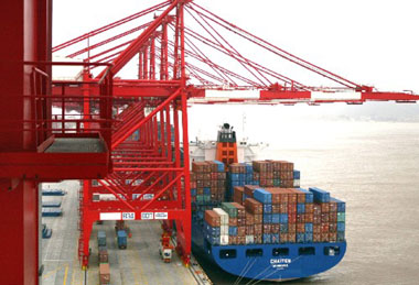 12月8日,一艘大型集裝箱船在上海洋山港二期碼頭裝運集裝箱。(新華社發)