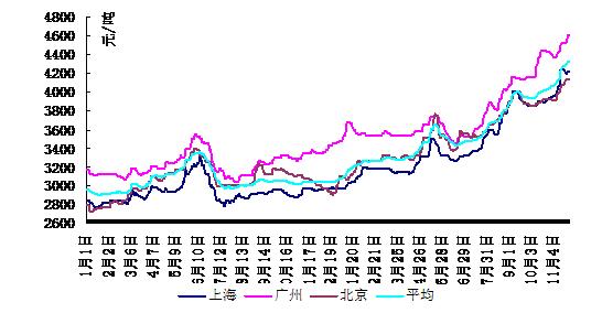 11月份國內(nèi)建筑鋼材整體需求表現(xiàn)依然旺盛,截至月末,全國24個主要城市6.5mm普線平均市場價格在4116元/噸,較10月末上漲343元/噸;6.5mm高線平均價格在4383元/噸,較10月末上漲381元/噸;20mm螺紋鋼平均市場價格在4421元/噸,較10月末上漲380元/噸。