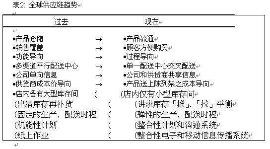 小木百貨連鎖這次的供應(yīng)鏈五年改造計(jì)劃中的行動(dòng)方案、發(fā)展遠(yuǎn)景和利潤(rùn)目標(biāo)仍維持方向不變,繼續(xù)向前挺進(jìn)落實(shí)!竸(chuàng)新」、「利潤(rùn)」和「執(zhí)行過(guò)程」之間的互動(dòng)是團(tuán)隊(duì)成員們?nèi)〉霉沧R(shí)的關(guān)鍵,讓更有效率的整合系統(tǒng)和金援得以如計(jì)劃所擬逐一到位。1996、1997和1998的利潤(rùn)目標(biāo)是整個(gè)改造工程的核心焦點(diǎn),但當(dāng)我們檢視全球供應(yīng)鏈的發(fā)展趨勢(shì)時(shí)(請(qǐng)參閱表2),事實(shí)上,不難發(fā)現(xiàn)小木百貨連鎖的改革和其它零售商的操作模式基本上是沒(méi)多大差別的。究竟小木的供應(yīng)鏈改造工程計(jì)劃跟其它零售商有什幺不一樣的地方?它最大的不同乃在于: