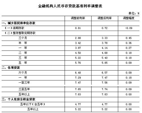 為貫徹從緊的貨幣政策,中國人民銀行決定:從2007年12月21日起調(diào)整金融機構(gòu)人民幣存貸款基準(zhǔn)利率,一年期存款基準(zhǔn)利率由現(xiàn)行的3.87%提高到4.14%,上調(diào)0.27個百分點;一年期貸款基準(zhǔn)利率由現(xiàn)行的7.29%提高到7.47%,上調(diào)0.18個百分點;其他各檔次存、貸款基準(zhǔn)利率相應(yīng)調(diào)整。個人住房公積金貸款利率保持不變(具體水平見附表)。此次調(diào)整有利于防止經(jīng)濟增長由偏快轉(zhuǎn)為過熱,防止物價由結(jié)構(gòu)性上漲演變?yōu)槊黠@的通貨膨脹。
