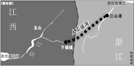 浙贛兩省山相連、路相通,水卻不對流。發(fā)源于浙贛兩省交界懷玉山的信江,是鄱陽湖水系五大河流之一,全長351公里,經(jīng)上饒、鷹潭等縣市注入鄱陽湖。規(guī)劃中的浙贛人工運(yùn)河是指,從錢塘江的上游——浙江省江山市江山港至上饒信江之間修建一條人工運(yùn)河,從而達(dá)到錢塘江與鄱陽湖貫通的目的。