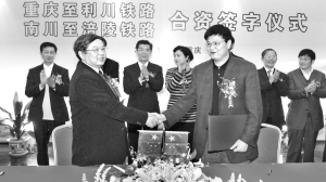 昨日,鐵道部出資人代表成都鐵路局和重慶市政府出資人代表重慶市開發(fā)投資有限責(zé)任公司就渝利、南涪鐵路合資合同正式簽字,組建渝利鐵路公司、南涪鐵路公司。