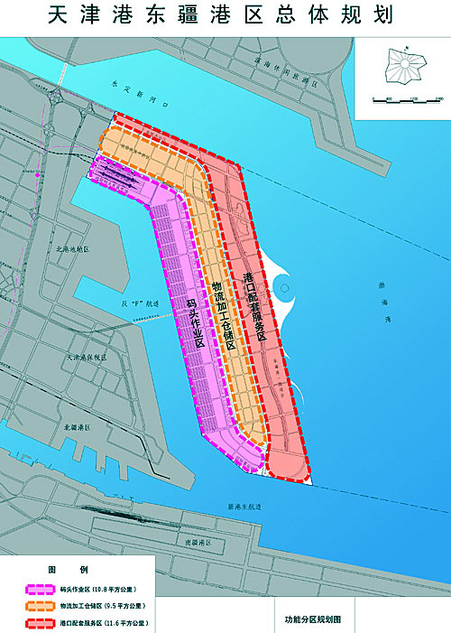 按照規劃,東疆港區分為碼頭作業區、物流加工區、港口綜合配套服務區“三大區域”,具備集裝箱碼頭裝卸、集裝箱物流加工、商務貿易、生活居住、休閑旅游“五大功能”。