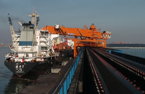 1月28日,一艘輪船在秦皇島港裝貨。2006年秦皇島港年吞吐量突破2億噸,到2015年,該港計劃年吞吐量達到4億噸,在現有基礎上翻一番,“用8年時間再造一個秦皇島港”。 新華社記者 楊世堯 攝