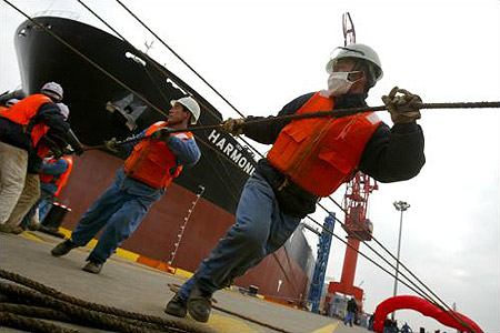 2006年12月29日,在外高橋造船廠工作人員正在引導試航后準備交付使用的的二艘貨船靠岸。以此標志著上海外高橋造船廠年產突破300萬噸。