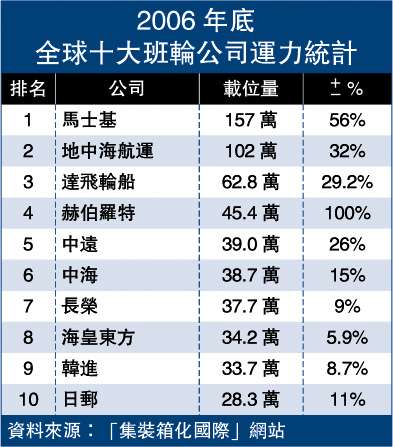 【大公報訊】英國“集裝箱化國際”雜志網(wǎng)站剛公布2006年班輪航運公司的業(yè)務(wù)表現(xiàn),去年全球班輪運輸公司運力增加了14%,是近六年來增幅最快的一年。