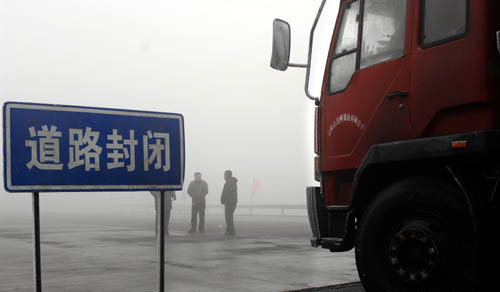 1月4日清晨,車輛滯留在已經(jīng)關(guān)閉了整整一夜的沈陽至丹東的高速公路路口。新華社記者 郭大岳 攝