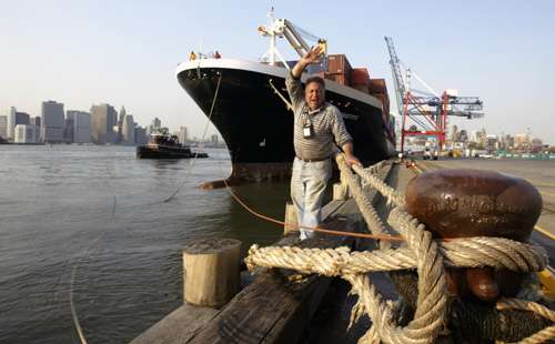 圖:紐約港布魯克林港區碼頭解纜員賓納杜胸前掛上工作證,這種證很快會取消,未來二十個月,他必須領取智能身份證進出碼頭(資料圖片)