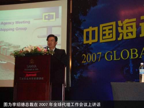 2007年2月9-10日,中國海運2007年全球代理工作會議在海南三亞市召開。與會代表共計230多名,分別來自中國海運在87個國家和地區的控股公司、代表處、獨資或合資的代理公司以及委托代理。中國海運李紹德總裁、馬澤華黨組書記、張國發副總裁等領導,以及集團有關部門、中海集運、浦海航運、五洲航運的負責人出席了會議。