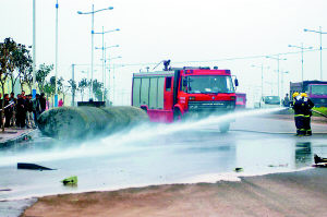 中午11點(diǎn)30分,記者趕到九龍坡華福路人和場往西彭方向1公里處的車禍現(xiàn)場時,田壩消防中隊(duì)的官兵正在用水槍出水,沖洗從硫酸罐里泄漏出的酸液。罐子被甩在往人和場方向的公路上,而運(yùn)送罐子的藍(lán)色大貨車則停在往西彭方向的公路另一側(cè)。旁邊還有一輛出租車后備廂遭撞壞,停靠在隔離帶附近,碎玻璃渣撒得滿地都是。