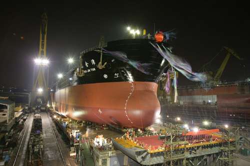 圖:由廣船國際承造的華南最大穿梭油船下水現場(本報攝)