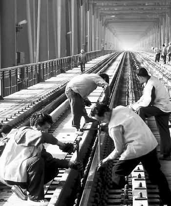 4月15日,南昌鐵路局的工作人員在京九線九江長(zhǎng)江大橋鐵路橋整修鐵軌。近日,南昌鐵路局九江橋工段的工作人員對(duì)該段所有線路、道岔進(jìn)行整修,確保第六次鐵路大提速在該段順利進(jìn)行。胡國(guó)林?jǐn)z(新華社發(fā))