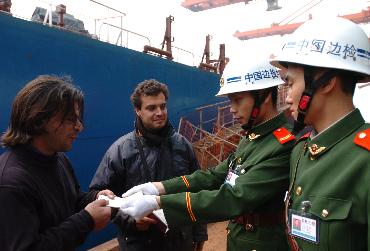 兩名邊防武警戰士在曹妃甸礦石碼頭檢查一艘外輪船員的入境證件(3月21日攝)。