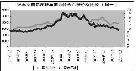 2005年來國際原糖和國內(nèi)白糖綜合價(jià)格比較(圖片來源:中國證券報(bào))