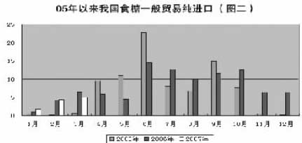 再把2005年1月以來我國食糖每月一般貿(mào)易純進(jìn)口制作統(tǒng)計(jì)圖(如圖二),可以反映出食糖進(jìn)口的兩大特征,第一、我國年度食糖進(jìn)口基本呈兩邊低中間高特點(diǎn),即進(jìn)口主要發(fā)生在4月-10月。第二、月進(jìn)口量與國內(nèi)外價(jià)差相關(guān)性較強(qiáng)。與圖一比較后可以發(fā)現(xiàn),當(dāng)05年4月到9月國內(nèi)外價(jià)差較大時(shí)進(jìn)口量也較大,06年9月至今價(jià)差持續(xù)保持較大,06年進(jìn)口量自6月份增大后一直到年末都沒有衰減,而往年最后一季度已很少進(jìn)口。如2004年最后一季度貿(mào)易純進(jìn)口4.54萬噸,2005年這一數(shù)字為8.35,2006年這一數(shù)字卻是25.51萬噸。根據(jù)這兩大特征預(yù)測,當(dāng)前正處于進(jìn)口量應(yīng)該增大的時(shí)期,接下來,我國的一般貿(mào)易純進(jìn)口很可能放大。