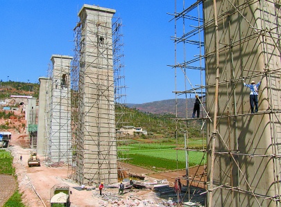 泛亞鐵路重要組成部分的玉蒙鐵路自開工建設(shè)以來進展順利。目前,通海境內(nèi)全長300多米的漢邑大橋基礎(chǔ)工程已經(jīng)完工,只待隧道打通后架設(shè)橋梁。圖為施工人員在拆除腳手架,并對橋墩進行打磨。