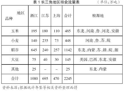 2004年,長三角地區(qū)糧食流入總量達(dá)到2030萬噸,其中浙江省873萬噸、江蘇省695萬噸,上海市470萬噸(估計(jì))。主要流入糧食品種為:玉米(485萬噸)、小麥(448萬噸)稻谷(935萬噸)、大豆(145萬噸)、其他(25萬噸)。具體情況見表1。