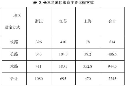 長三角地區(qū)由于水路運(yùn)輸發(fā)達(dá),因此糧食運(yùn)輸中水路運(yùn)輸所占比重相對較大。但由于糧源地大多來自內(nèi)陸省份,因此在糧食流入鐵路運(yùn)輸所占比重仍然很大。具體情況如表2。