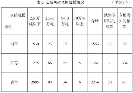 長三角地區(qū)倉儲資源的另一表現(xiàn)為糧食倉庫數(shù)量眾多,僅江浙兩省倉庫數(shù)量就達(dá)到2934個(gè),其中2.5萬噸以下倉容量的倉庫達(dá)到95.6%,小倉庫遍布各地,而大型倉庫尤其是10萬噸以上的倉庫只有6個(gè),主要集中在江蘇境內(nèi)(見表5)。
