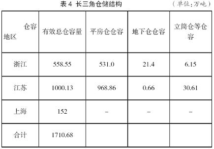 長三角地區(qū)作為我國糧食主銷區(qū),糧食倉儲資源豐富,兩省一市共擁有有效倉容量1710.68萬噸,其中主要以平房倉為主,占到總倉容量的95%左右。其他倉庫種類如地下倉、立筒倉、樓房倉等數(shù)量和倉容量相對較。ㄒ姳4)。