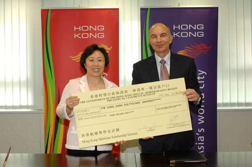 圖:鄭汝樺(左)移交一張四百萬元支票予理工大學副校長戴務勤,以作推行香港航運獎學金之用