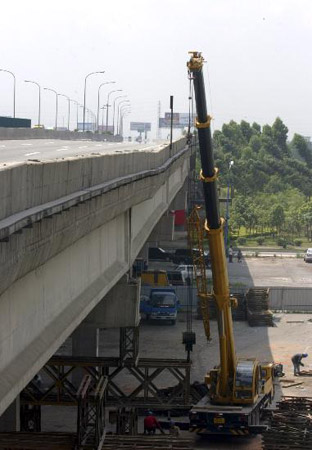 廣深高速麻涌段出口處近百米長(zhǎng)路面下陷,專家查明是由于麻涌段23號(hào)橋柱下沉導(dǎo)致。昨天下午,記者來(lái)到廣深高速塌陷的路面上看到,23號(hào)橋柱連接的路面整塊凹了下去,路政、交警部門在路口設(shè)置了路障指揮交通。23號(hào)橋柱旁的支撐架已經(jīng)搭成,維修工作正緊張進(jìn)行。