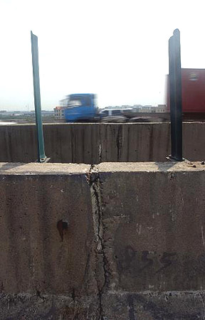 高速路下陷處水泥護(hù)欄出現(xiàn)裂縫。