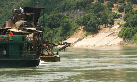 業(yè)內(nèi)人士說,不算水口水電站大壩前的船只,單記者在江面上所見的20多艘運(yùn)砂船,一天至少有6000方采砂量,一個月按20天算也有12萬方。一年按10個月算也有120萬方。遠(yuǎn)遠(yuǎn)超過政府規(guī)定的40萬方開采總量。