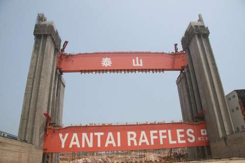 該鋼結構橫梁箱體截面為18×4.5米,長130.2米,自重4200噸。據了解,2號橫梁也將于近期提升至100米高的支柱上。