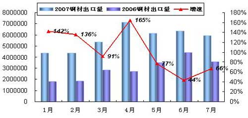 2007年上半年螺紋、線材合計累計出口了795萬噸,比上年同期的388萬噸,多出口了408萬噸,同比增長了1.05倍。出口量比重較上年同期略有增長,上半年累計出口量比重為24%,比上年同期增長了0.8個百分點。