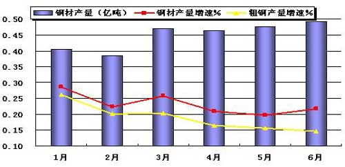 二、盡管國內(nèi)粗鋼產(chǎn)量增速呈現(xiàn)持續(xù)降低的態(tài)勢,但實際上粗鋼產(chǎn)量的數(shù)量卻是逐月上升的趨勢,至少在2-6月是這樣的。國內(nèi)鋼材產(chǎn)量增速也保持了低增長,截至6月份鋼材產(chǎn)量增速為21.8%,比年初增速累計降低了6.7個百分點。