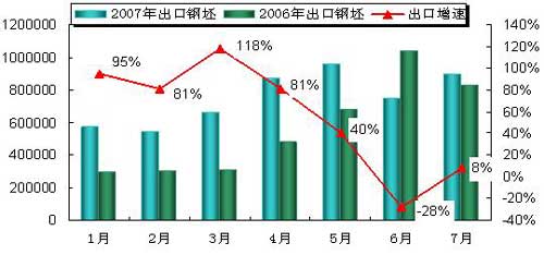 鋼坯出口在7月份出現(xiàn)了一個明顯的反彈,環(huán)比漲幅增加了36個百分點,出口量也環(huán)比上升了15萬噸,達到了90萬噸,這個數(shù)字可以排在前7個月出口鋼坯數(shù)量的第二位。即使在出口增幅最低的6月份-28%,國內(nèi)鋼坯出口的數(shù)量仍達到了75.2萬噸,這個數(shù)字實際上是1-7月排在第三位的出口量。