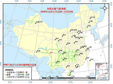 中國氣象局與交通運(yùn)輸部2008年10月11日聯(lián)合發(fā)布全國主要公路氣象預(yù)報(bào)