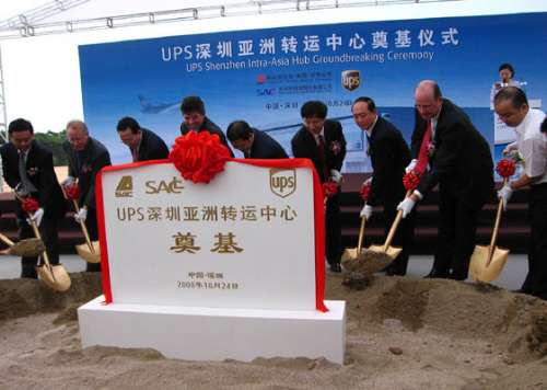 深圳市市長許宗衡、副市長張思平、深圳市機場(集團)有限公司董事長黃傳奇、UPS國際總裁布魯托、亞太地區(qū)總裁伍德沃德、中國區(qū)總裁兼亞太區(qū)資深副總裁黎松江以及亞太地區(qū)運輸事務高級副總裁廖啟明出席了奠基儀式。