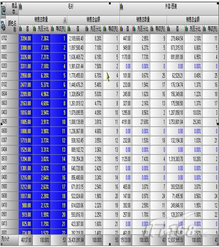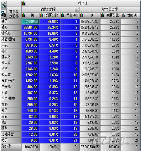 3、各類別銷售量及占比:比如去年本季襯衫銷售多少、褲子銷售多少等等,在褲子當(dāng)中牛仔多少、西褲多少,長褲多少、七分褲多少……都要進(jìn)行統(tǒng)計與分析。另外一方面,要看哪些類別銷售有困難、哪些類別銷售還有潛力,這樣在所統(tǒng)計出的數(shù)據(jù)后面做適當(dāng)?shù)恼{(diào)整。