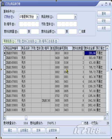 對于代理商而言,訂什么樣的貨,訂的總量是多少,總額是多少,顏色比例是否合理,款式比例是否合理,上市波段是否合理。這些數(shù)據(jù)都是需要在對新產(chǎn)品有了一個全盤的了解之后,經(jīng)過幾輪的篩選與評估才能決定的。所以,在訂貨會現(xiàn)場就會有一個“草單”的概念,也就是代理商的非正式訂貨,訂貨會時,先把看中的新產(chǎn)品以“草單”(或者也可以稱為代理商訂貨意向單)錄入到ERP系統(tǒng)中,然后用ERP系統(tǒng)對這些訂單按照之前設(shè)定好的分析模型進(jìn)行分析,得到這張訂單的合理性評估,然后開始第二輪的篩選,如此反復(fù),直到得到最終訂單。